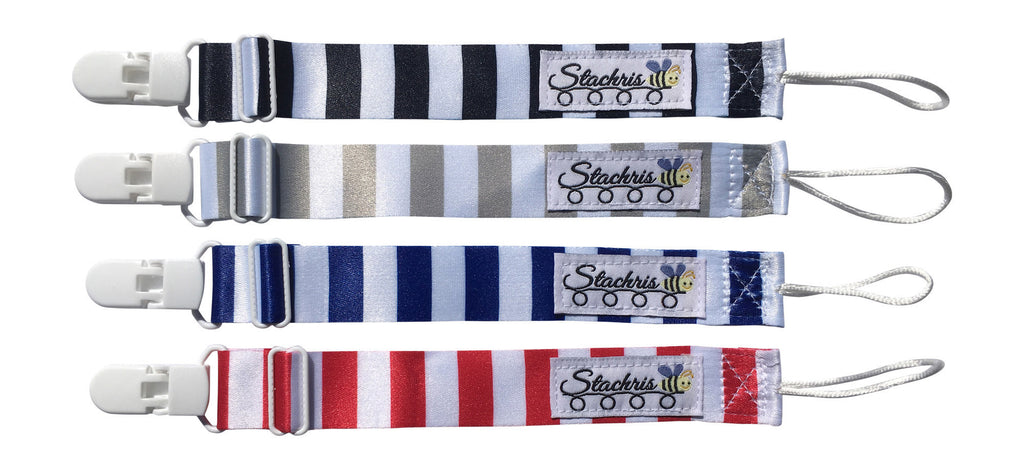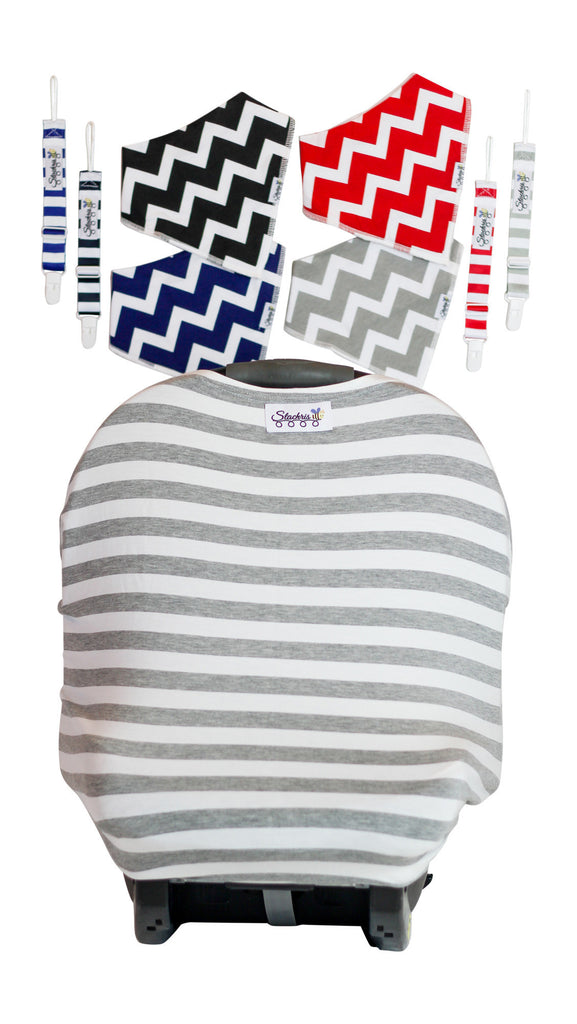 Gray Stripe Car Seat Cover With Four Bandana Bibs and Four Pacifier Clips